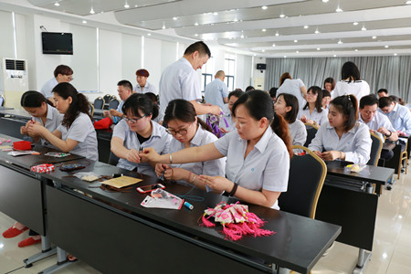 在活動(dòng)開展前,公司工會(huì)精心策劃,提前準(zhǔn)備了艾葉、薰衣草、具有驅(qū)蚊效果的中藥、針線包以及布料等制作香囊的材料。活動(dòng)現(xiàn)場熱鬧非凡,公交員工們圍坐在一起,共同觀看了香囊制作步驟圖,隨后大伙兒紛紛拿起香囊材料,擼起袖子,摩拳擦掌,一副躍躍欲試的樣子。手工活比較巧的女同胞們大膽嘗試了難度系數(shù)較高的手工縫制香囊,她們拿起步驟圖仔細(xì)研究和琢磨,還時(shí)不時(shí)地交流技巧和心得。“陳姐,這個(gè)藏針縫法我們倆看了好幾遍說明,但還是不得要領(lǐng),您教教我們吧?!薄胺畮煾?,您看我這樣縫對嗎?”許多參與活動(dòng)的80后、90后公交員工都是第一次制作香囊,她們在老師傅們的親自示范下最終獨(dú)立完成了縫制、裝香料、封口配繩、穿珠等工序,當(dāng)一個(gè)個(gè)飽滿又精致的三角香囊做好后,她們的內(nèi)心油然而生一股成就感,紛紛拿起手機(jī)拍照,在朋友圈曬出自己的手工成果。男同胞們也不甘示弱,選擇了相對比較簡單的手工灌裝香囊,你拿袋子,我裝香料,大家分工配合,不一會(huì)兒就做了許多漂亮又實(shí)用的香囊,得到了在場女同胞的夸贊,難得展現(xiàn)了硬漢柔情的一面。