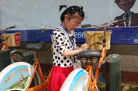 4月17日下午,公共自行車公司迎來一群可愛的小朋友,這是青鳥青鳶項(xiàng)目組組織的“精彩周末,公益出行”志愿活動(dòng),這群小朋友就是這個(gè)活動(dòng)的志愿者。小志愿者們拎著小水桶,拿著抹布,有模有樣地擦洗起公共自行車來。一個(gè)個(gè)小小的身子掩映在自行車中,只露出小小的腦袋。在小志愿者們的辛勤勞動(dòng)之下,橙色的自行車換上一副嶄新的面貌。通過這樣的活動(dòng)使愛護(hù)公共財(cái)物、踐行綠色出行的種子扎根幼小的心靈,同時(shí)也向廣大市民傳遞了綠色出行的理念。