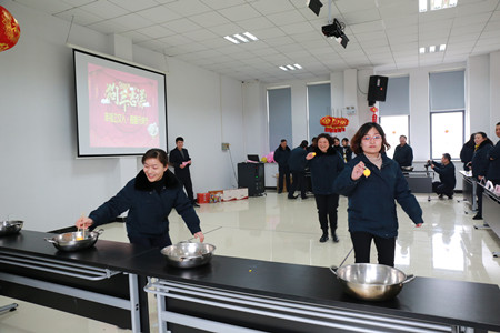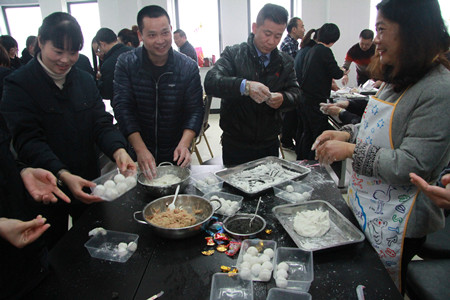 “元宵”慶典活動以“聲聲報?!钡牟葰馇蛴螒蜷_場,將現(xiàn)場氣氛推向了第一個小高潮,游戲以一對一踩對方腳邊綁上的氣球形式開展。參賽者各個身懷絕技,互不相讓,圍觀者們也時不時爆發(fā)出陣陣歡快的笑聲。隨后是“團團圓圓”“幸福滾滾”等幾輪小游戲。到了傳統(tǒng)節(jié)目“猜燈謎”環(huán)節(jié),大家的積極性愈發(fā)高漲,主持人話筒還來不及遞到跟前,大家就已紛紛搶答,氣氛十分熱鬧。所有小游戲結(jié)束后,是主題包元宵活動。大家齊心協(xié)力、分工明確,揉面的揉面,拌餡的拌餡,“要裹緊一點,不然一會兒一煮就散了?!鼻拜厒儠r不時地向“新手”們傳授著經(jīng)驗,不一會兒,一個個白白圓圓的湯圓就擺滿了桌面,現(xiàn)場一派熱鬧歡騰的景象。