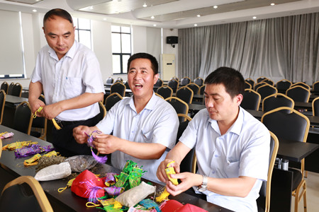 在活動(dòng)開展前,公司工會(huì)精心策劃,提前準(zhǔn)備了艾葉、薰衣草、具有驅(qū)蚊效果的中藥、針線包以及布料等制作香囊的材料。活動(dòng)現(xiàn)場熱鬧非凡,公交員工們圍坐在一起,共同觀看了香囊制作步驟圖,隨后大伙兒紛紛拿起香囊材料,擼起袖子,摩拳擦掌,一副躍躍欲試的樣子。手工活比較巧的女同胞們大膽嘗試了難度系數(shù)較高的手工縫制香囊,她們拿起步驟圖仔細(xì)研究和琢磨,還時(shí)不時(shí)地交流技巧和心得。“陳姐,這個(gè)藏針縫法我們倆看了好幾遍說明,但還是不得要領(lǐng),您教教我們吧?!薄胺畮煾?,您看我這樣縫對嗎?”許多參與活動(dòng)的80后、90后公交員工都是第一次制作香囊,她們在老師傅們的親自示范下最終獨(dú)立完成了縫制、裝香料、封口配繩、穿珠等工序,當(dāng)一個(gè)個(gè)飽滿又精致的三角香囊做好后,她們的內(nèi)心油然而生一股成就感,紛紛拿起手機(jī)拍照,在朋友圈曬出自己的手工成果。男同胞們也不甘示弱,選擇了相對比較簡單的手工灌裝香囊,你拿袋子,我裝香料,大家分工配合,不一會(huì)兒就做了許多漂亮又實(shí)用的香囊,得到了在場女同胞的夸贊,難得展現(xiàn)了硬漢柔情的一面。